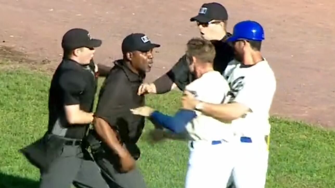 Pas content, le joueur de deuxième but des Boulders Tucker Nathans a alors vivement protesté, ce qui a mené à son expulsion de la rencontre. L'échange de politesses s'est alors prolongé et Nicholson a alors semblé frapper Nathans au ventre.
