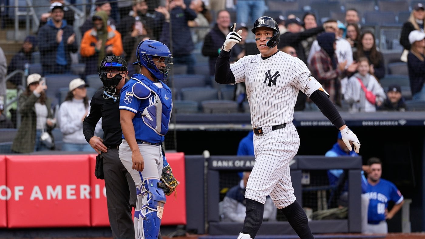 Après que le début du match ait été retardé de 2h45, Judge a donné une avance de 2-0 aux siens contre Cole Ragans (0-4) en envoyant le premier lancer dans le filet au-dessus de Monument Park au champ centre. Il s’agissait de sa sixième longue balle en huit matchs et son cinquième en première manche cette saison.