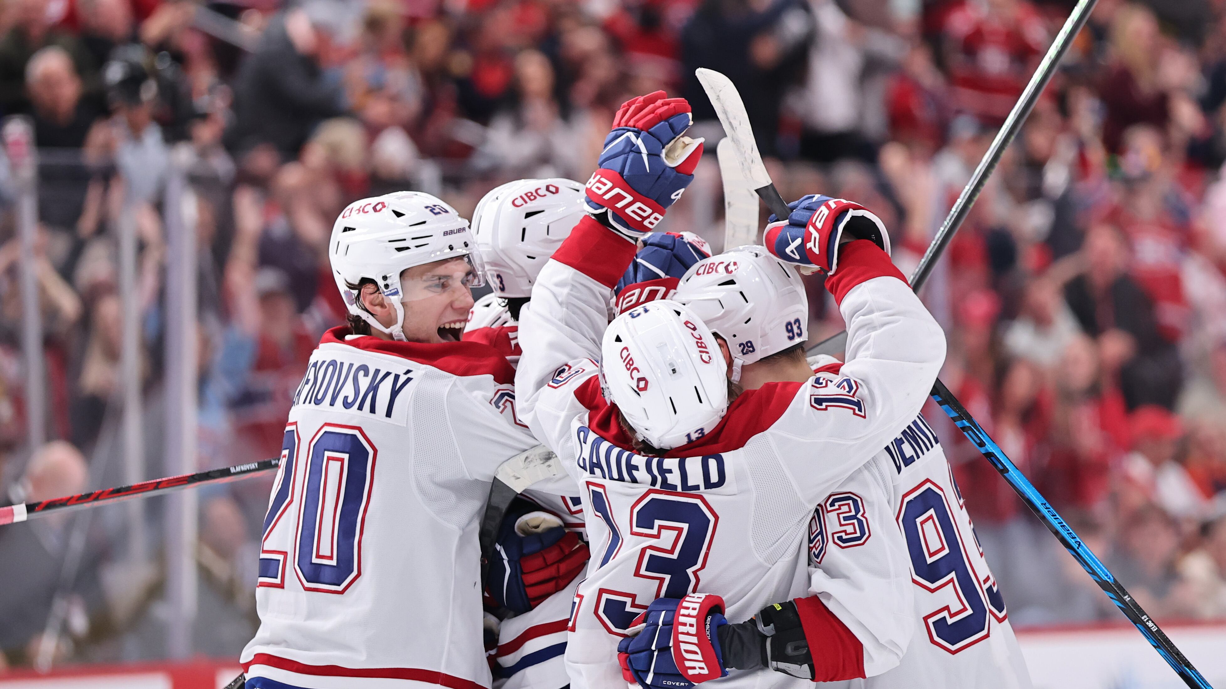 Les joueurs du Canadien se sont immédiatement rués vers Montembeault pour célébrer avec lui.