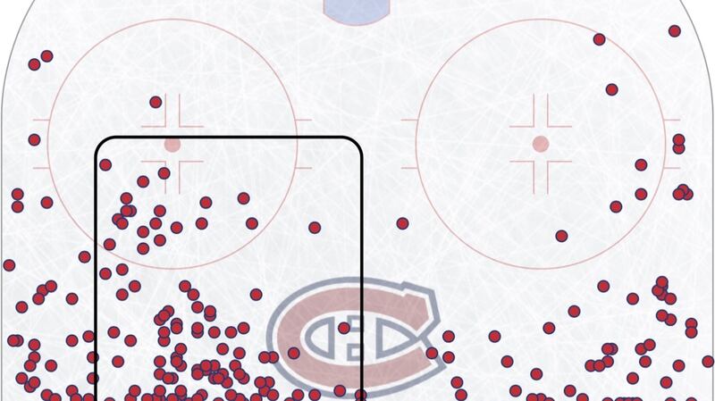 En regardant la localisation de toutes les réceptions de passe en zone offensive de Subban sur l'avantage numérique cette saison, ce que nous pouvons y constater n'est pas très encourageant.