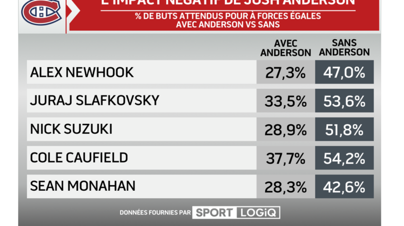 Anderson a carrément été un trou noir de production et de jeu positif pour quiconque se retrouve à ses côtés. Slafkovsky a notamment connu de loin son meilleur match de l'année la minute qu'il a été séparé de l'attaquant de puissance samedi soir contre les Blues.
