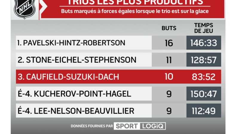 Le trio de Nick Suzuki, Cole Caufield et Kirby Dach continue de faire la pluie et le beau temps pour les Canadiens. Les trois joueurs combinent pour 32 points depuis le match contre les Blues de Saint Louis. Ils ont aussi ravivé l'avantage numérique du CH, qui a un taux de réussite de 31,6 % à ses sept derniers matchs, après avoir converti sur seulement 4,2 % de ses opportunités lors des huit premières rencontres.