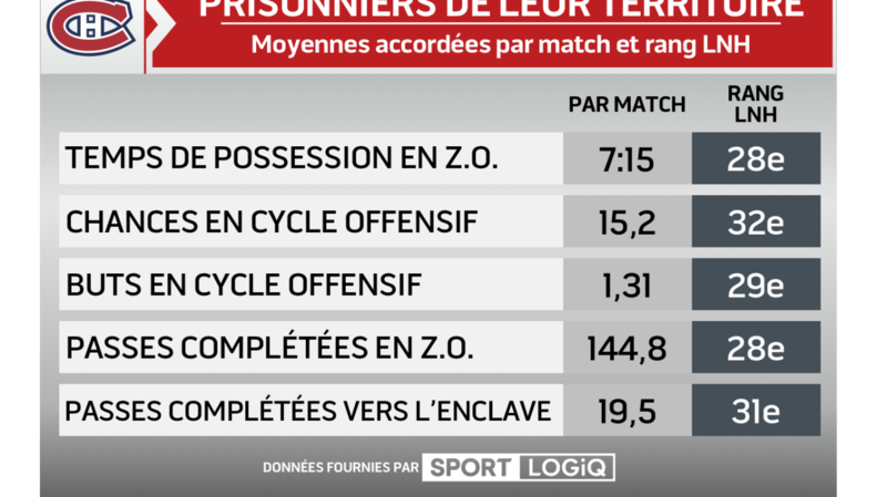 Pour vous donner une idée à quel point la défensive du CH est vulnérable à ce chapitre, 28 des 32 formations cette saison accordent moins de 12 chances en cycle par match. Ces chances sont responsables de 21 des 48 buts accordés par le Canadien cette saison, un de seulement quatre clubs à avoir accordé plus de 20 buts de la sorte.
