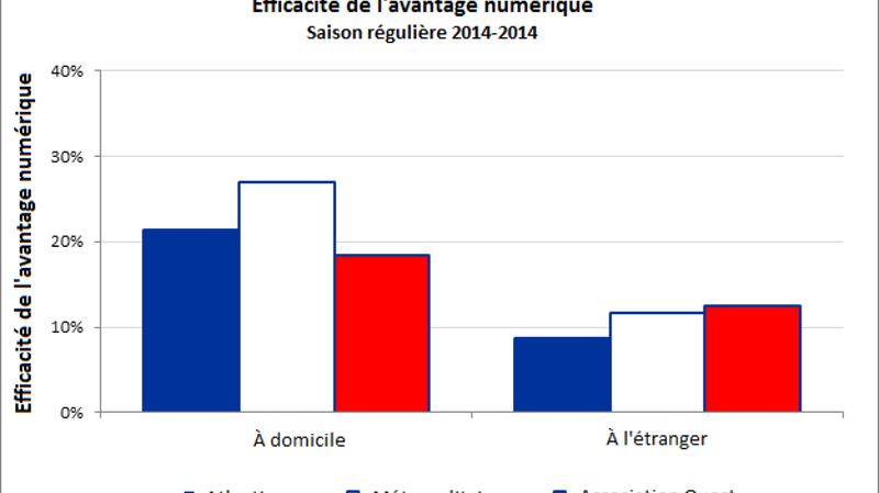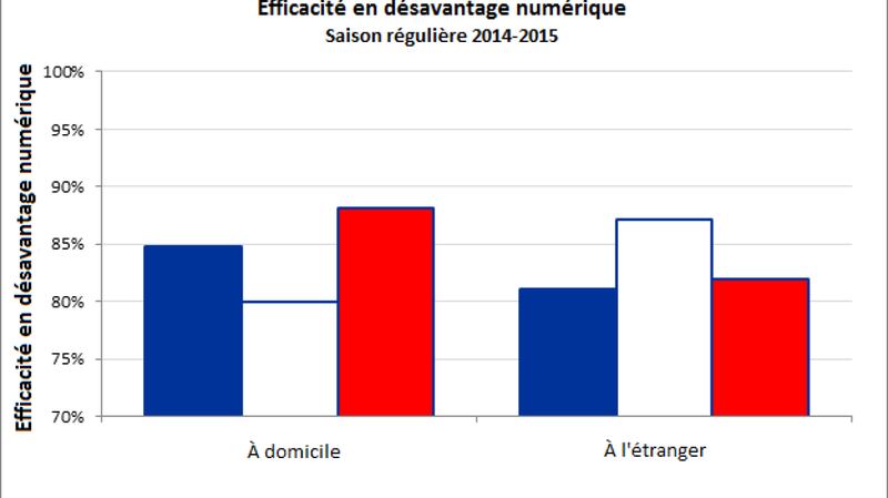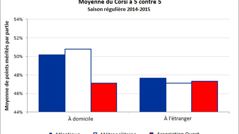 Les statistiques sont très variables à la maison comparativement à l'étranger, mais se ressemblent davantage entre divisions ou association. La plus grande exception est que l'attaque à cinq est bien moins efficace contre l'Atlantique que contre la Métropolitaine. Bien que l'efficacité soit plus élevée contre les formations de l'Ouest sur la route, les performances sont tout de même bien en deçà de celles au Centre Bell.