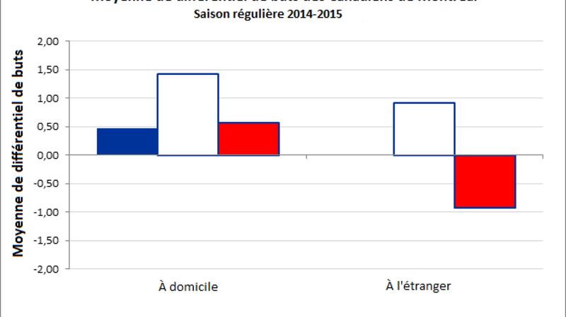 Les performances montréalaises sont moins bonnes à l'étranger, mais c'est compréhensible étant donné qu'il n'a pas le premier changement, ce qui affecte le taux de possession de rondelle. Ce qui est curieux, c'est que le CH a obtenu des points moins souvent dans la section Atlantique que dans la Métropolitaine malgré un Corsi 5 contre 5 similaire, sinon meilleur. Dans le même ordre d'idées, Montréal a eu de la difficulté contre les équipes de l'Ouest avec un différentiel de buts environnant 1,5, mais a des données de possession de rondelle à 5 contre 5 quasi identiques. Peut-être que l'explication ne se trouve pas à forces égales.