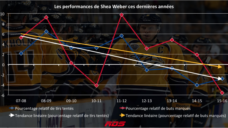 Tous les joueurs ralentissent avec l'âge, c'est inévitable. Cependant, pour le bien-fondé de l'argumentaire, assumons que le style de jeu prôné par Peter Laviolette ne fut pas favorable à Weber et que celui de Michel Therrien devrait davantage lui convenir. Alors, assumons que le niveau de jeu de Weber déclinera d'un taux de seulement 25% comparativement à celui que nous pouvons observer lors des huit dernières saisons, soit depuis 2007-08. Qu'est-ce que cela nous indique?