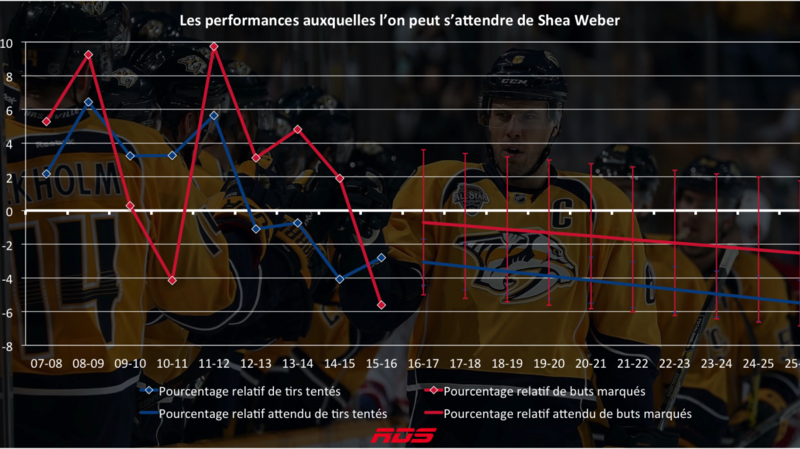 Les barres verticales croisant les tendances linéaires bleues et rouges illustrent les variations auxquelles l'on peut s'attendre au cours d'une même saison pour chacune de ces données. Ces résultats ne sont pas aussi prononcés que ceux des tendances linéaires initiales, comme nous avons diminué la baisse attendue du niveau de performance de Weber de 75%. Malgré tout, dès la saison prochaine, il y a plus de 50% de probabilités que Weber se classe sous la moyenne de ses coéquipiers en termes de différentiels relatifs de tirs tentés et de buts marqués. À la quatrième année, il y a près de 70% de probabilités qu'il soit devenu un joueur ayant un impact négatif.