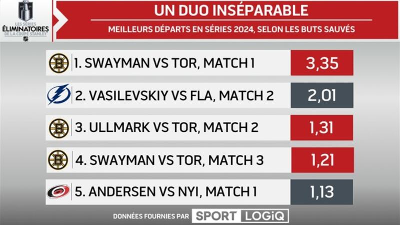 Dans une année avec plusieurs équipes qui ont décidé de rouler les dés avec des gardiens assez ordinaires (je parle de toi, Cam Talbot), Swayman et Ullmark continuent d'exceller en alternance. Ils combinent pour trois des quatre meilleurs départs en séries jusqu'à présent, incluant de loin le meilleur départ avec plus de trois buts sauvés par Swayman lors du premier match. Même la performance de Ullmark dans la défaite a gardé le match serré jusqu'à la fin. Les Bruins sont d'ailleurs passés bien près d'échanger ce dernier à la date limite des transactions.