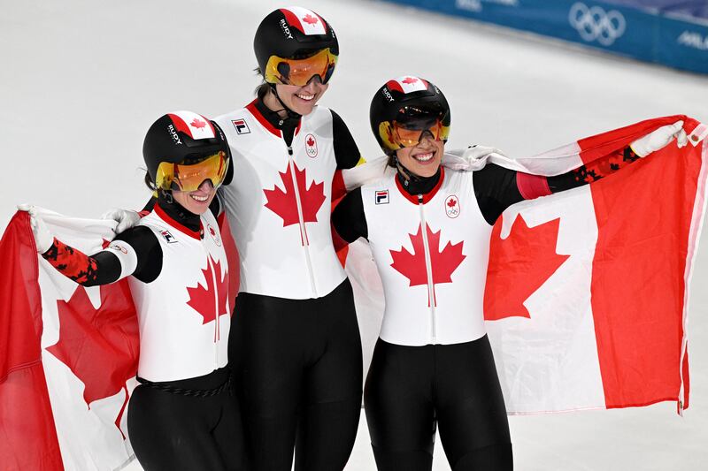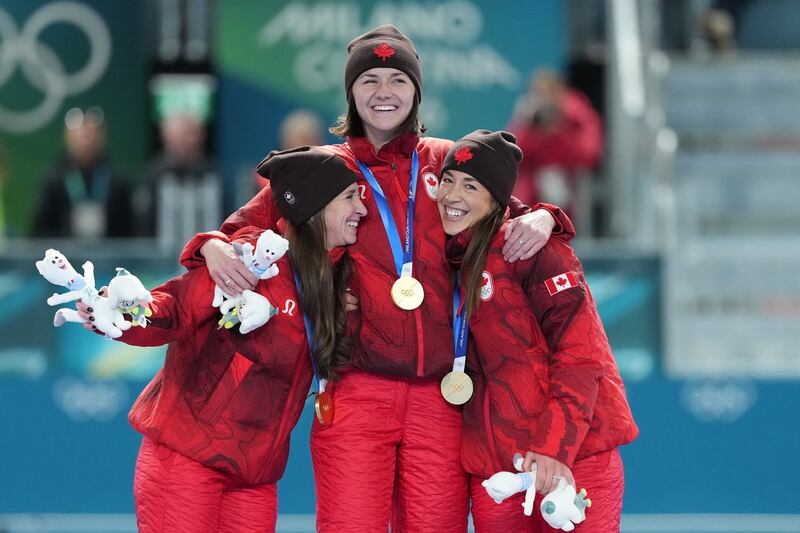 Canada's Ivanie Blondin, white armband, Valerie Maltais, red armband, Isabelle Weidemann, yellow armband, celebrate after winning the gold final of the women's team pursuit speedskating race at the 2026 Winter Olympics, in Milan, Italy, Tuesday, Feb. 17, 2026. THE CANADIAN PRESS/Nathan Denette (Nathan Denette/THE CANADIAN PRESS)